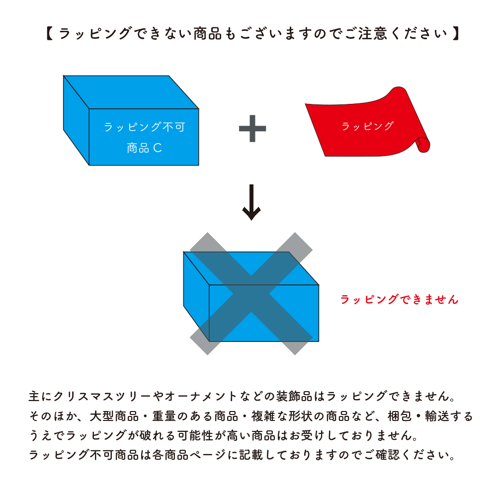 ※クリスマスツリーやオーナメント、シャボン玉など一部商品のラッピングはお受けしておりませんのでご了承下さいませ。ラッピング不可商品は各商品ページに記載しておりますのでご確認ください。