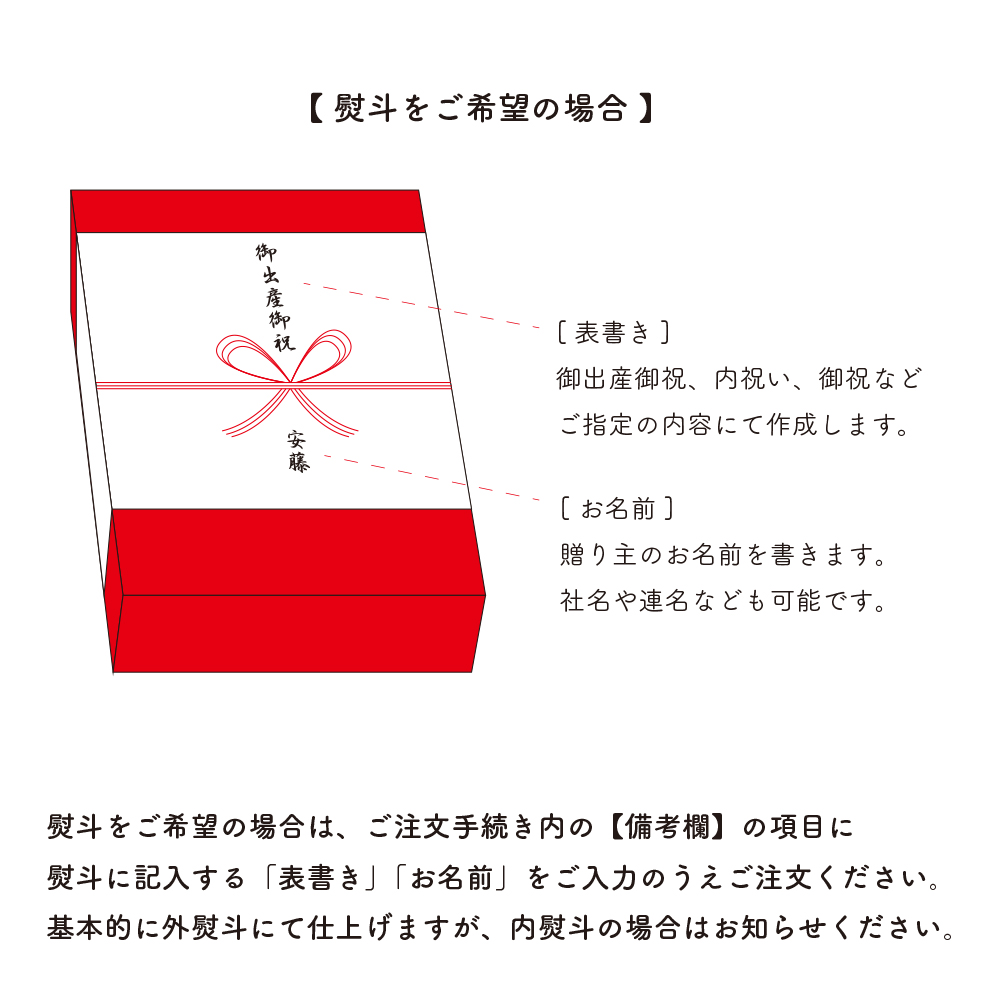 基本的に外熨斗となりますが、内熨斗をご希望の場合はその旨お知らせください。