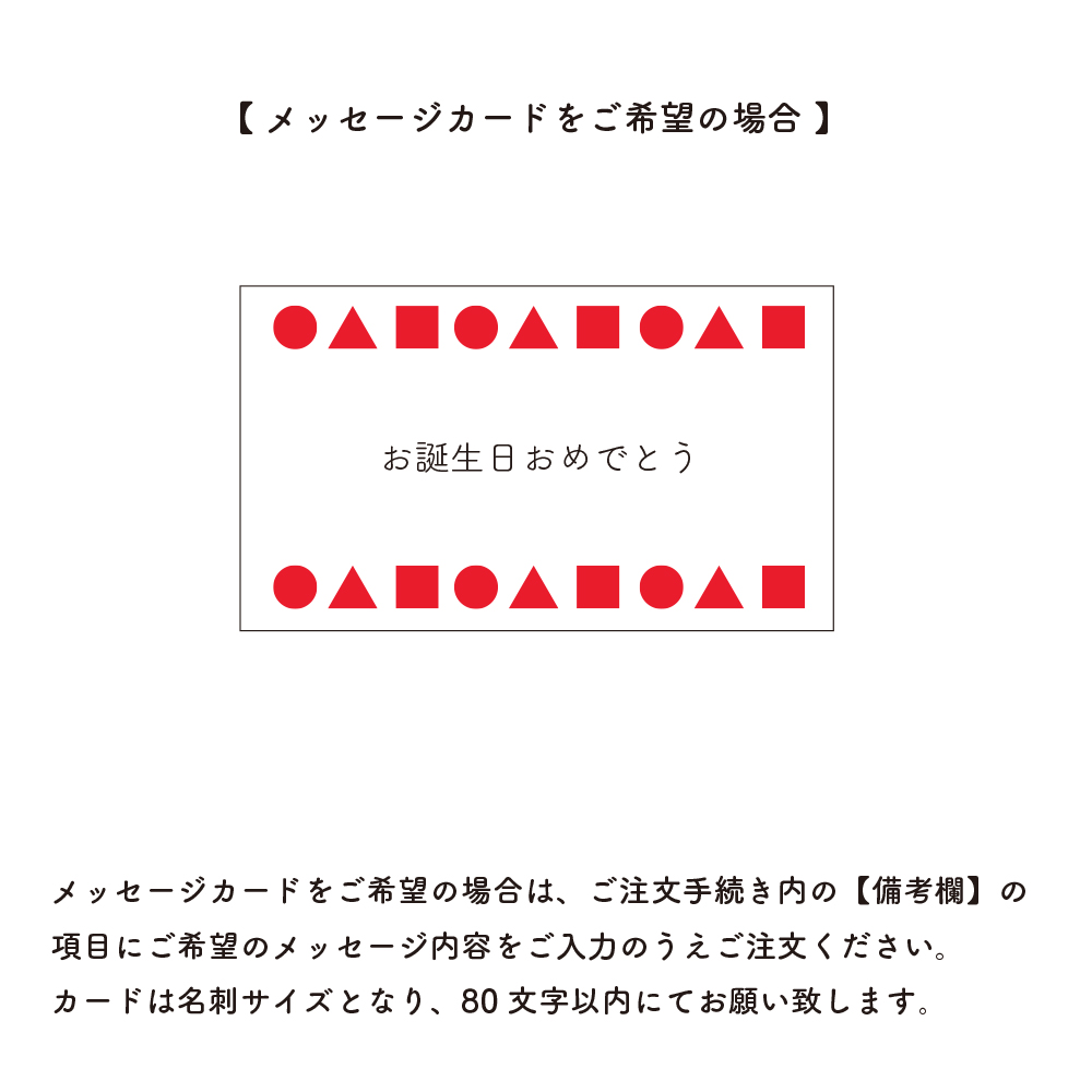 ご希望の場合は備考欄の項目に「メッセージカード希望」と「メッセージ内容」をご記入ください。メッセージ内容は最大で80文字以内にてお願い致します。