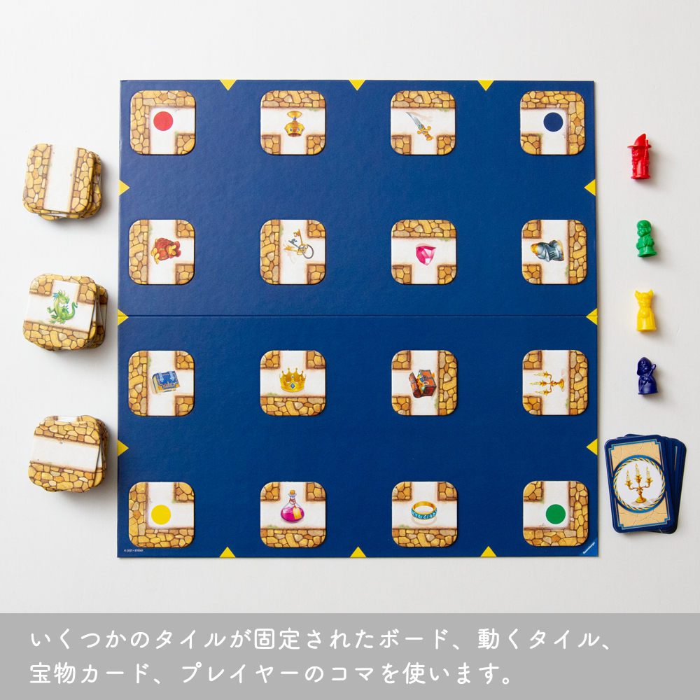 【セット内容】ゲームボード、木製コマ、迷路タイル、宝物カード。