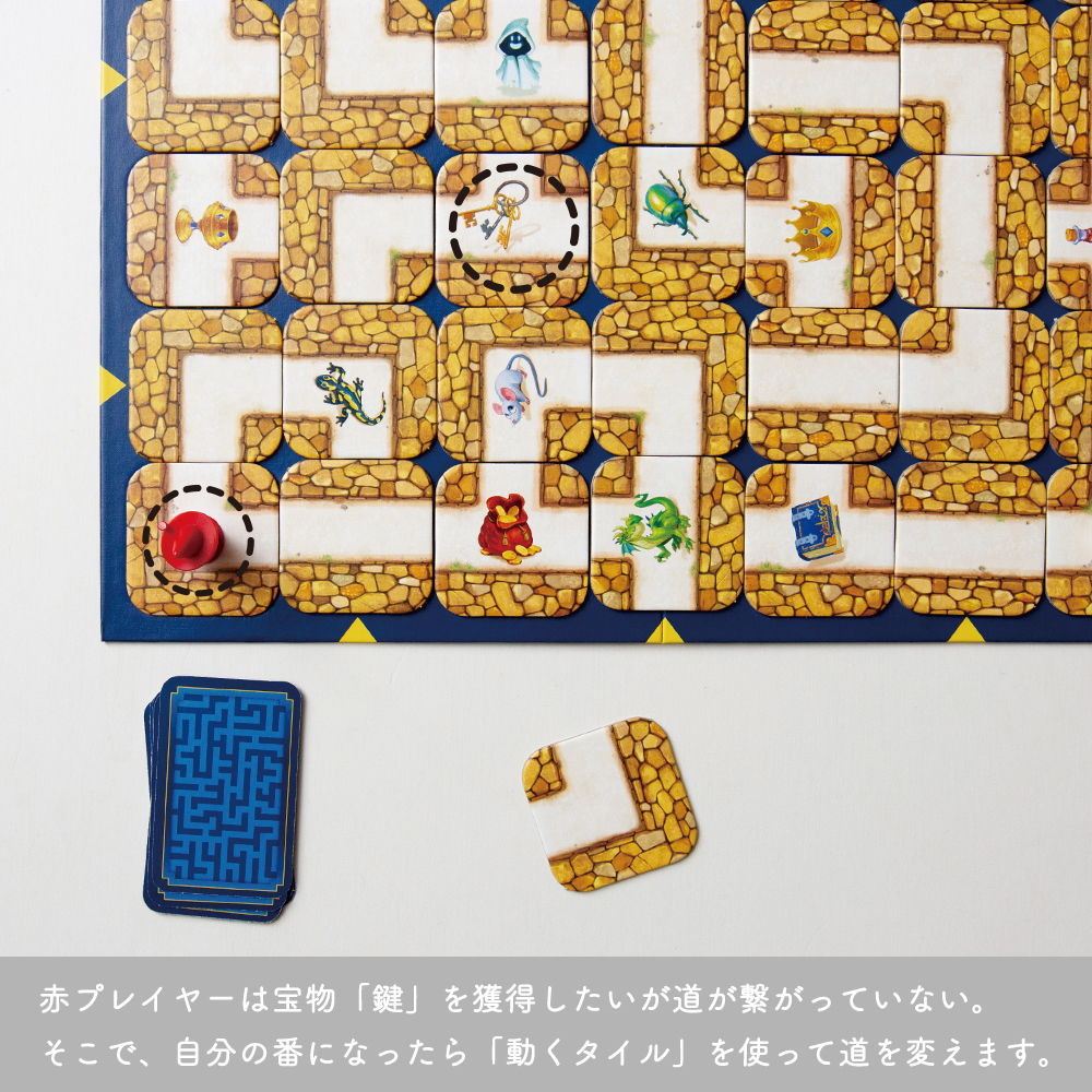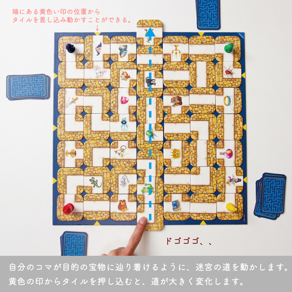 通路が動く不思議な迷路の中に「宝物」や「奇妙な生き物(これも宝物)」が隠されています。プレイヤーはこれらを集めてこなくてはなりませんが、そのためには巧みに迷路を動かさなければなりません。割り当てられた「宝物」を全て集め、最初に出発点に帰り着いたプレイヤーが勝者です。