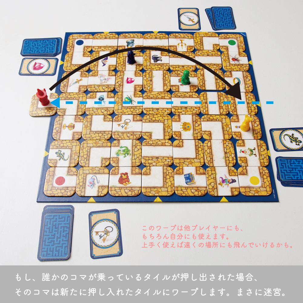 もしも迷路の端にいたら、タイルの移動で迷路ボードから押し出されてしまった場合は、 新たに押し込まれたタイルにワープします。