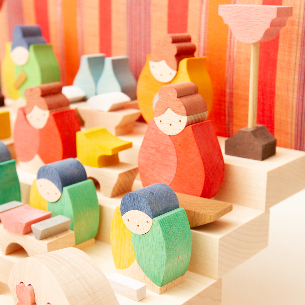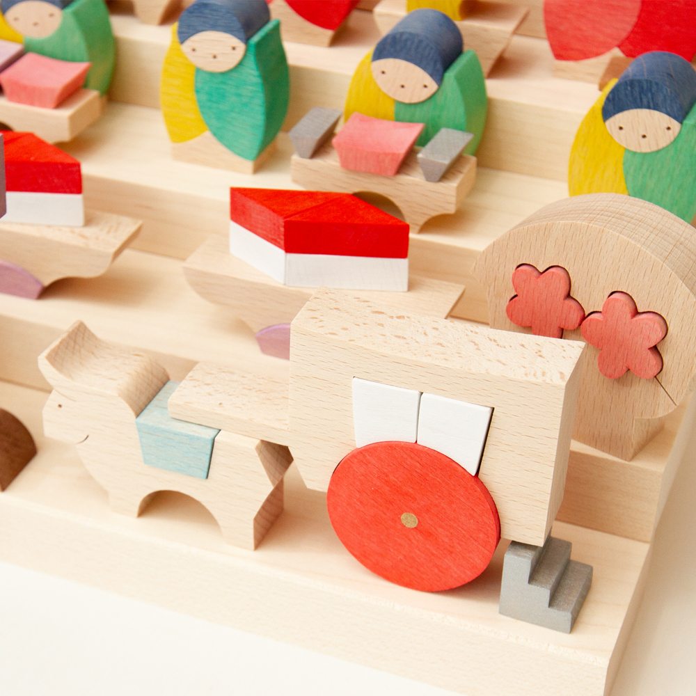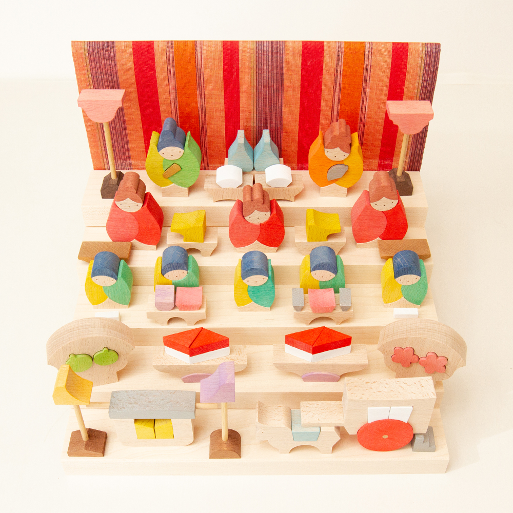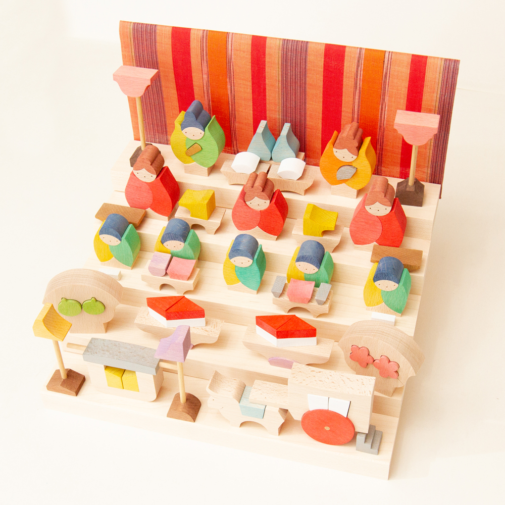 木の手触りが心地よく、子どもが「遊んで組み替えても良い」節句人形。
