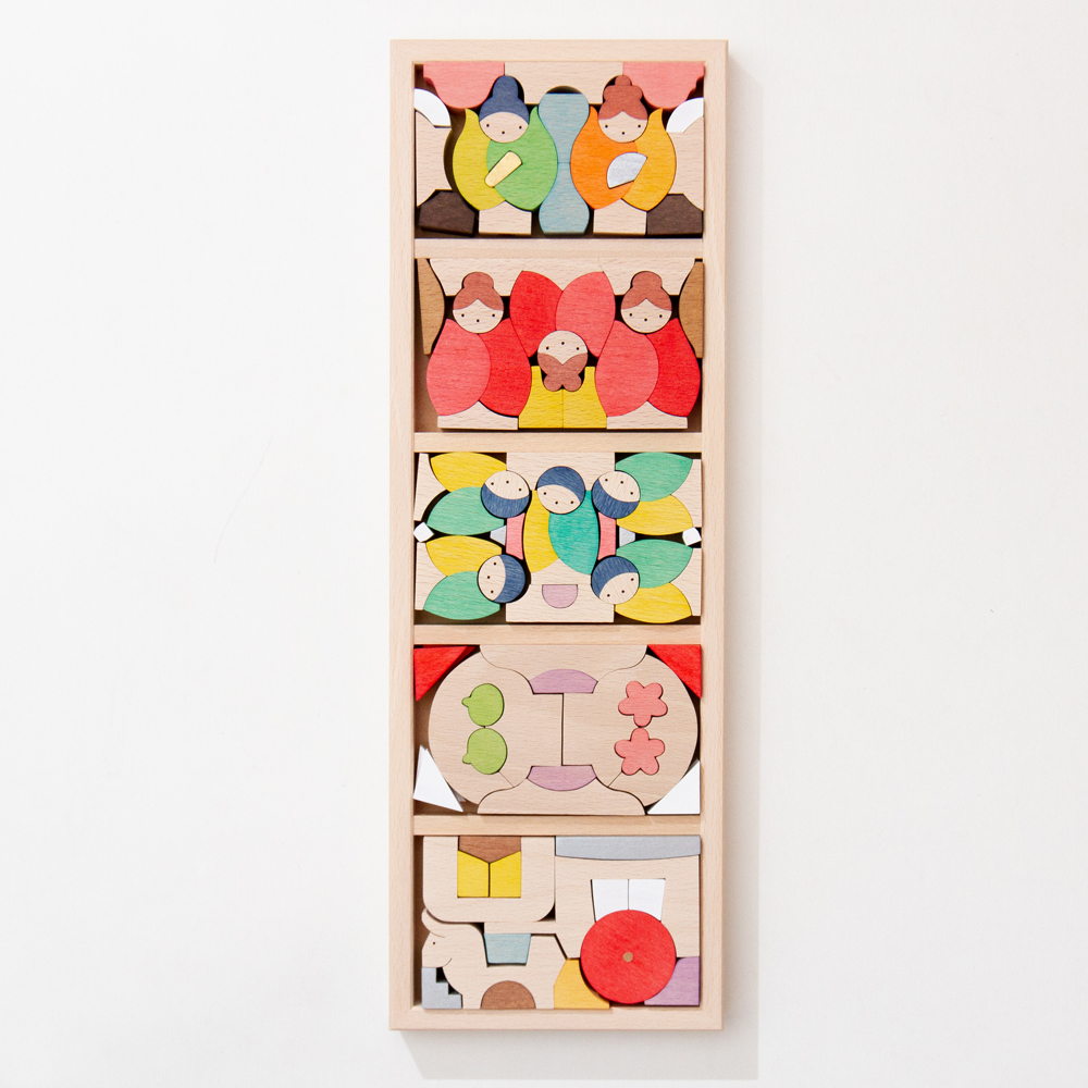 これはデザイナーの小黒さんが木彫家のご友人であった故・あらいみえ子さんから頂いた木彫りのひな人形を組み木に、
