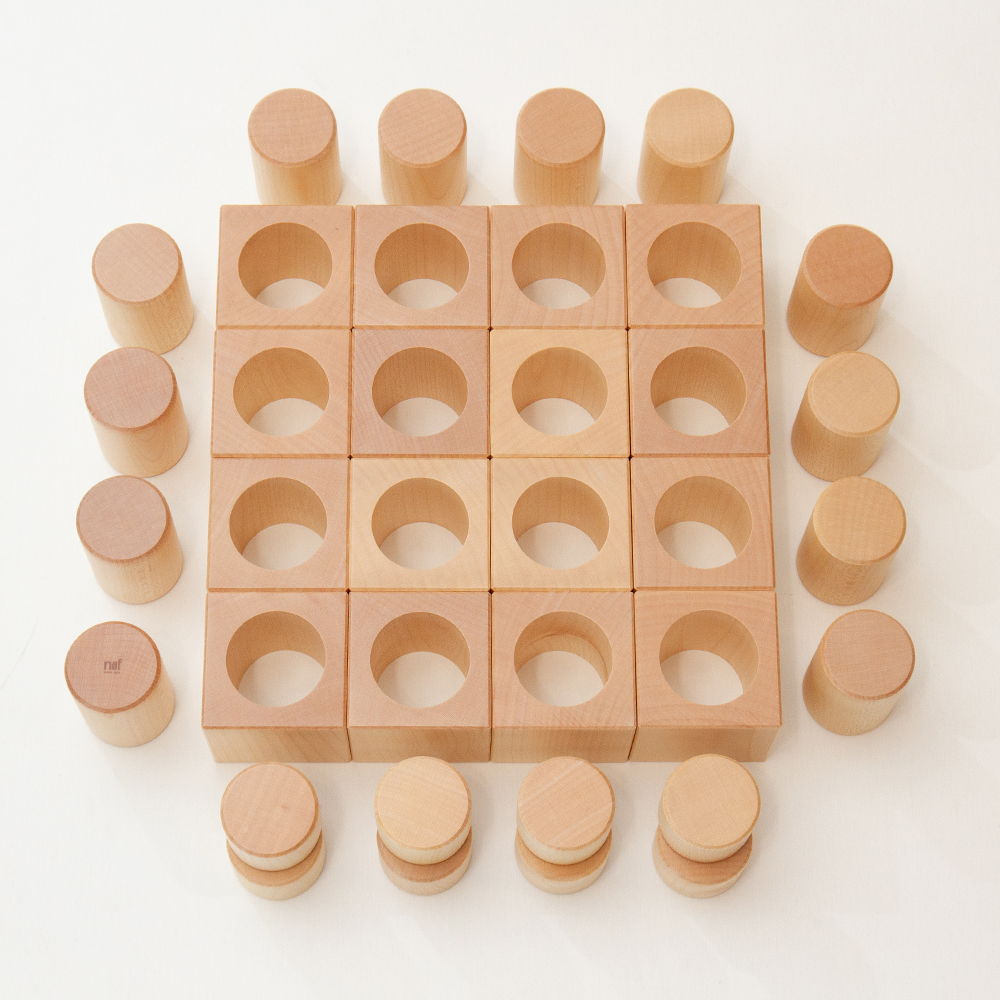 それが「きれいに収まっている」という見方もできるのですが、丸の円柱を少しズラして四角を繋げることで、写真のようにシカクのブロックを浮かせた吊り橋のような作品を作る事もできます。