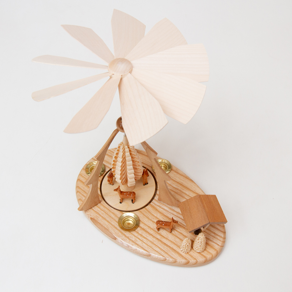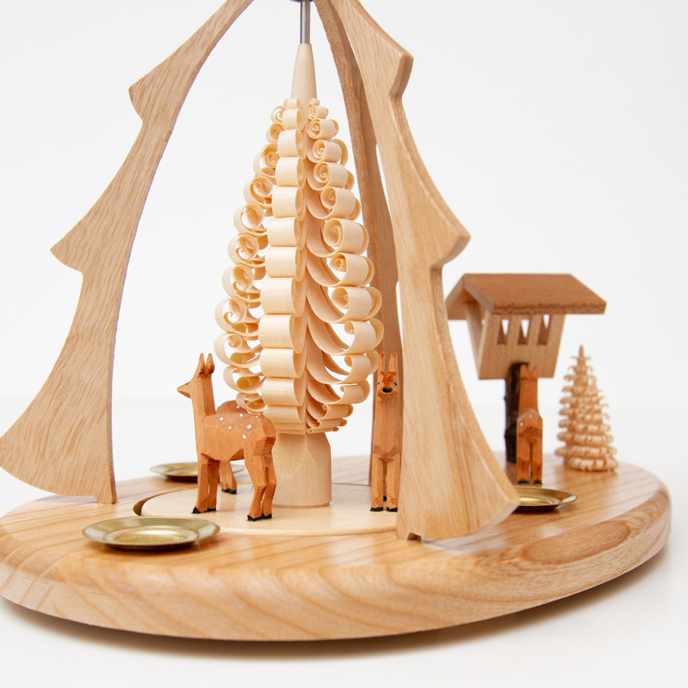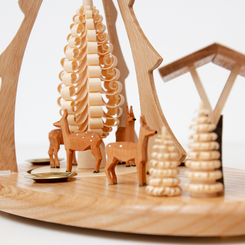 このクリスマスピラミッドはシュパンバウムのツリーと餌箱と鹿がモチーフとなっており、一本の棒から削られて作るシュパンバウムと言われるツリーの下に凛と佇む鹿と、餌箱をじっと見つめる鹿の姿が微笑ましいクリスマスピラミッド。