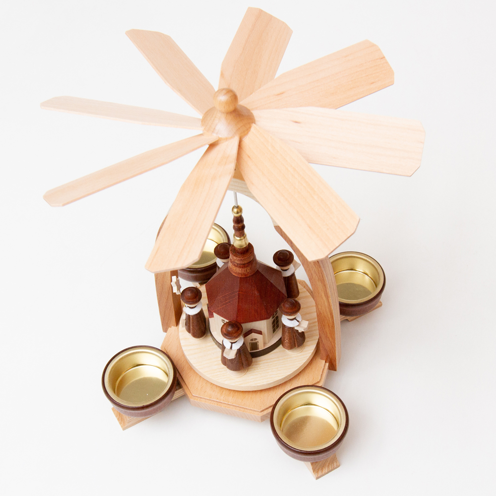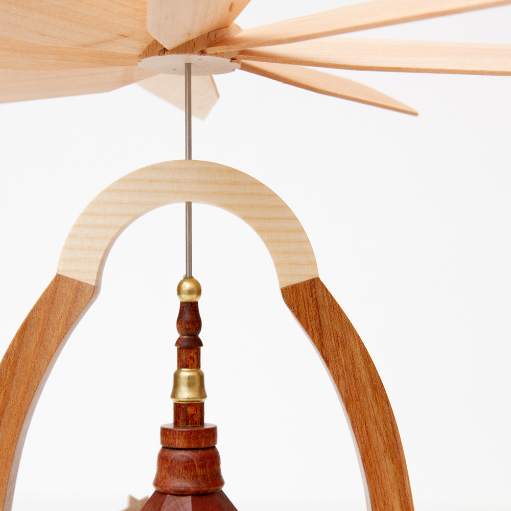 キャンドルの炎から生じる上昇気流でプロペラが回る仕組みのクリスマスピラミッド。