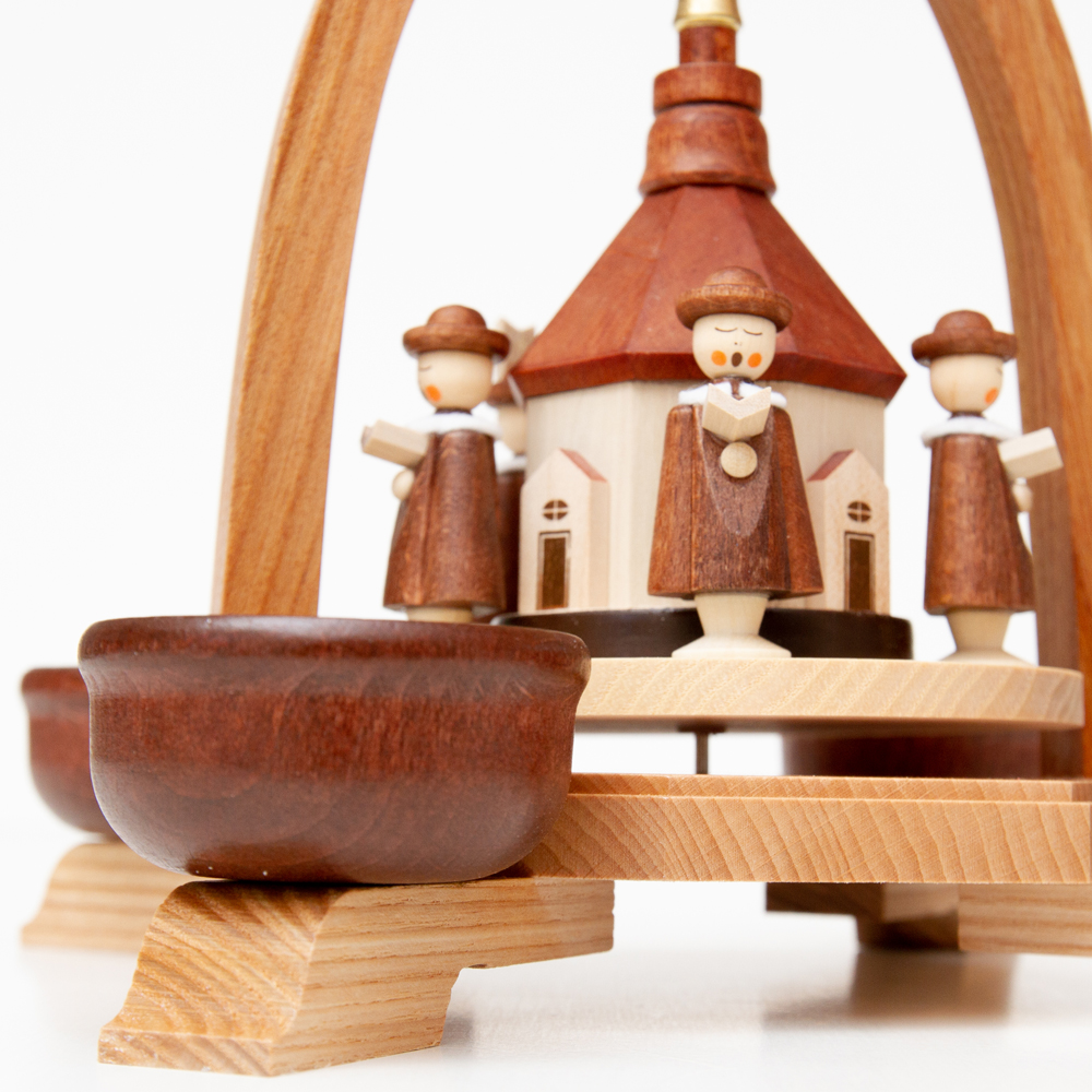 このクリスマスピラミッドは教会と聖歌隊がモチーフとなっており、ザイフェン教会の建物を聖歌隊が囲んで歌っている様子の美しいクリスマスピラミッド。