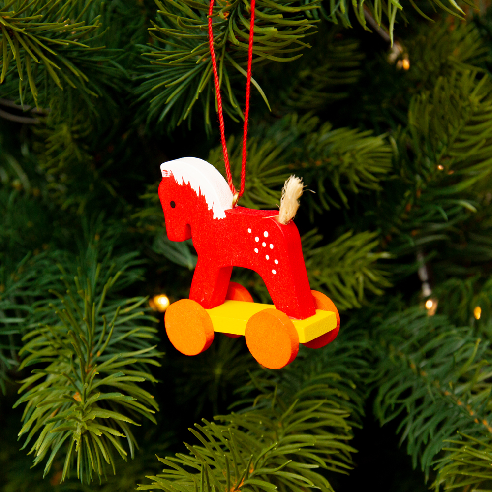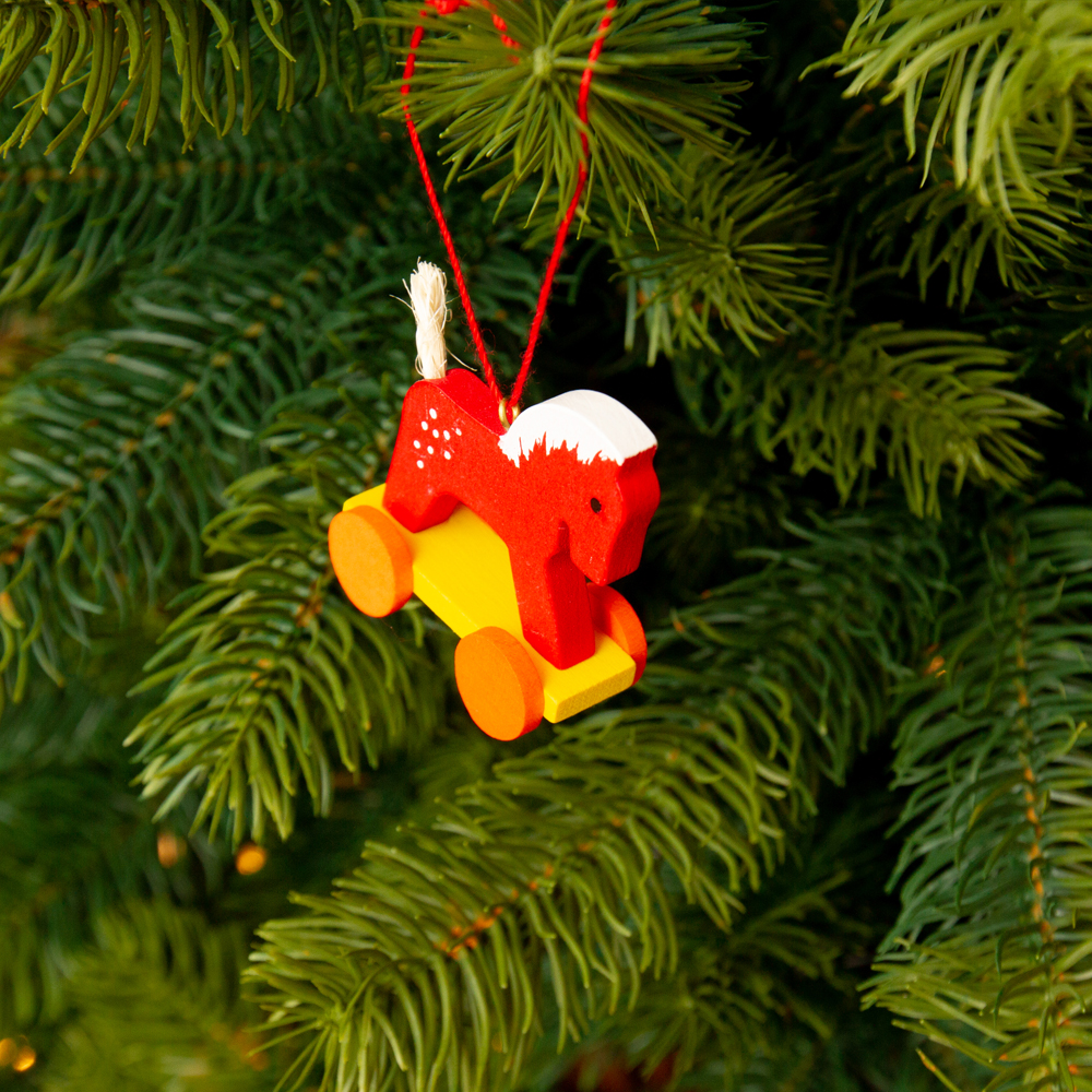 台車に赤い木馬が乗ったオーナメント。シンプルながらツリーに映えるかわいい色合いで、素材感がある尻尾が特徴的です。