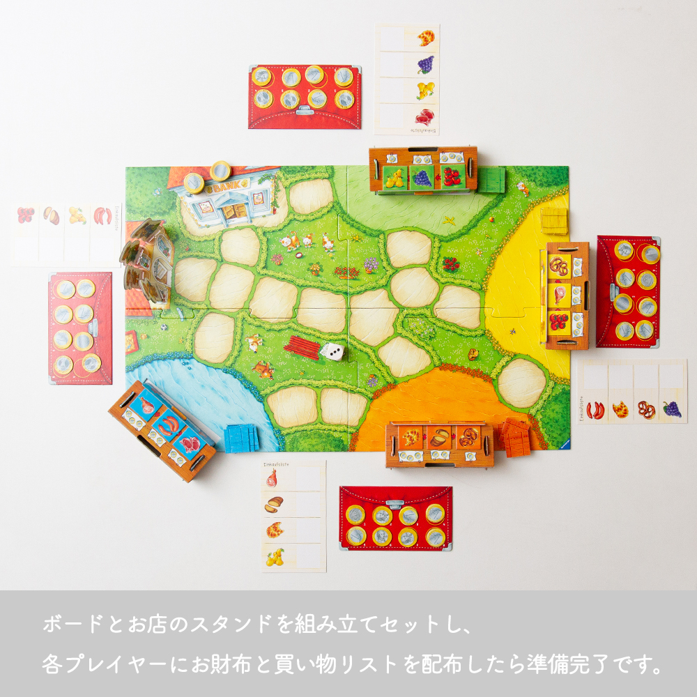 ボードと各お店の台を設置し、参加プレイヤーにお買い物リストとお財布とお金を配ったら準備完了です。