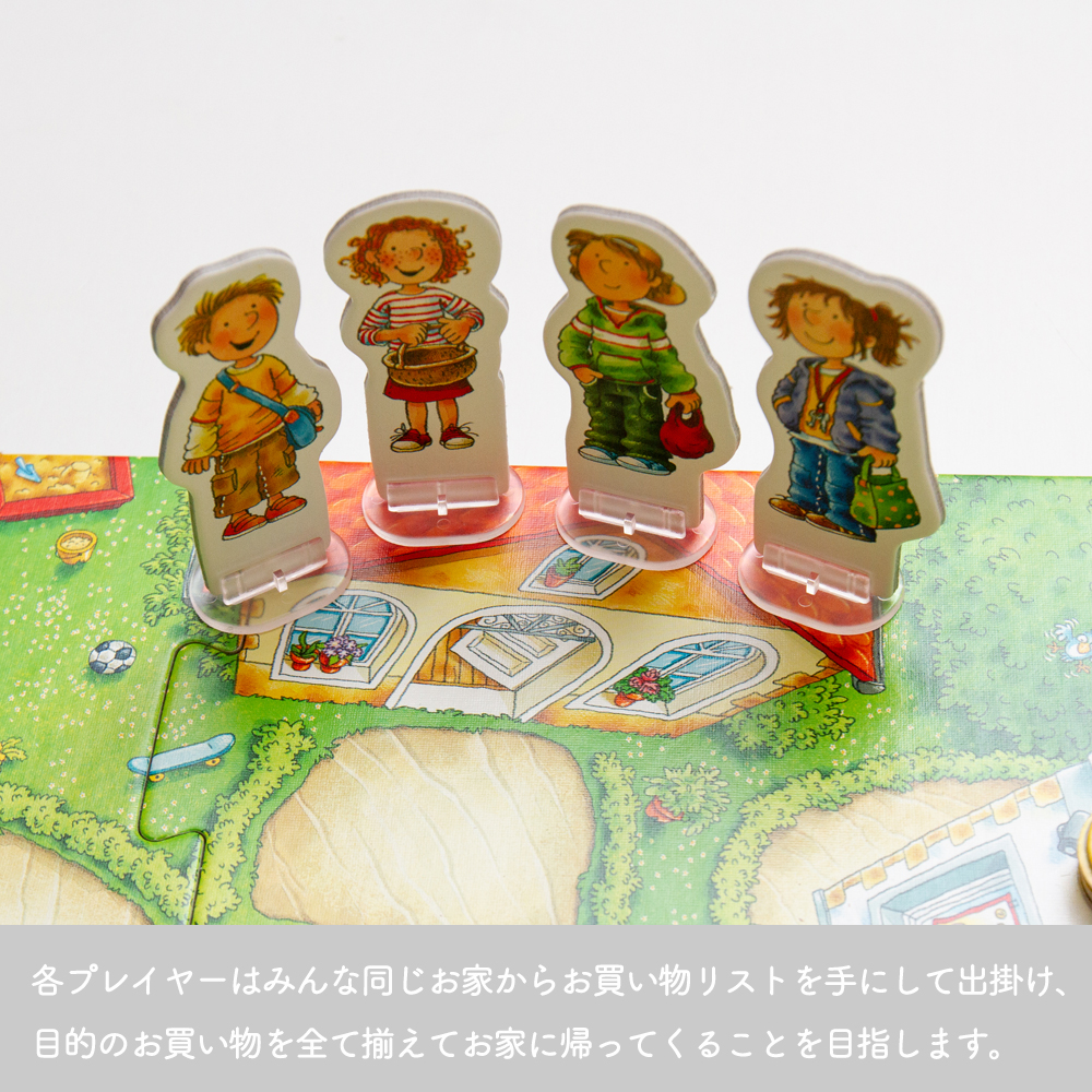 そうして持っているお買い物リストの全ての品物を買い、お家に戻って来れたらゴールです。 一番早くお家に着いたプレイヤーが勝者となります。