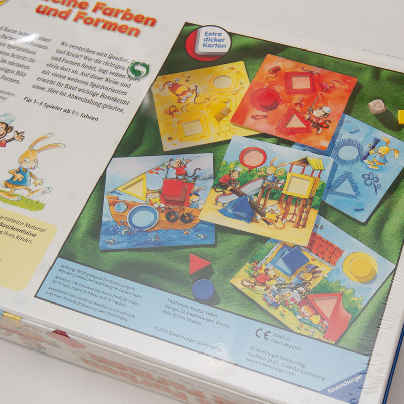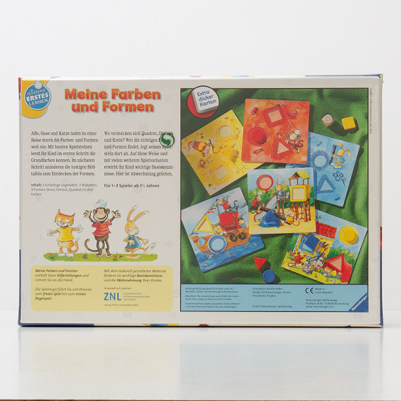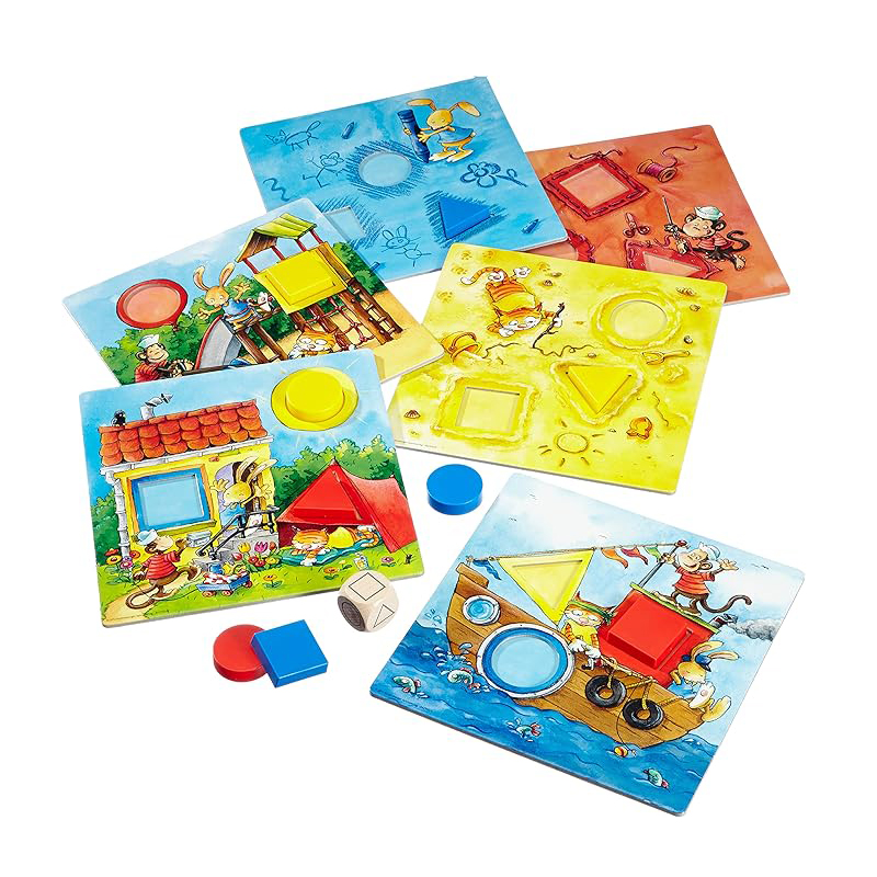 6種のボードと丸・三角・四角のピースを使って、形と色を学んでいくゲームです。