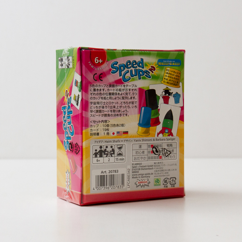 カードが19枚、カップが2セット入っており、スピードカップスのセットに追加することで、通常は4人のところ6人まで遊べて、通常のセットには入っていなかった奥行きをも判断しないとならない新しい課題が入っています。