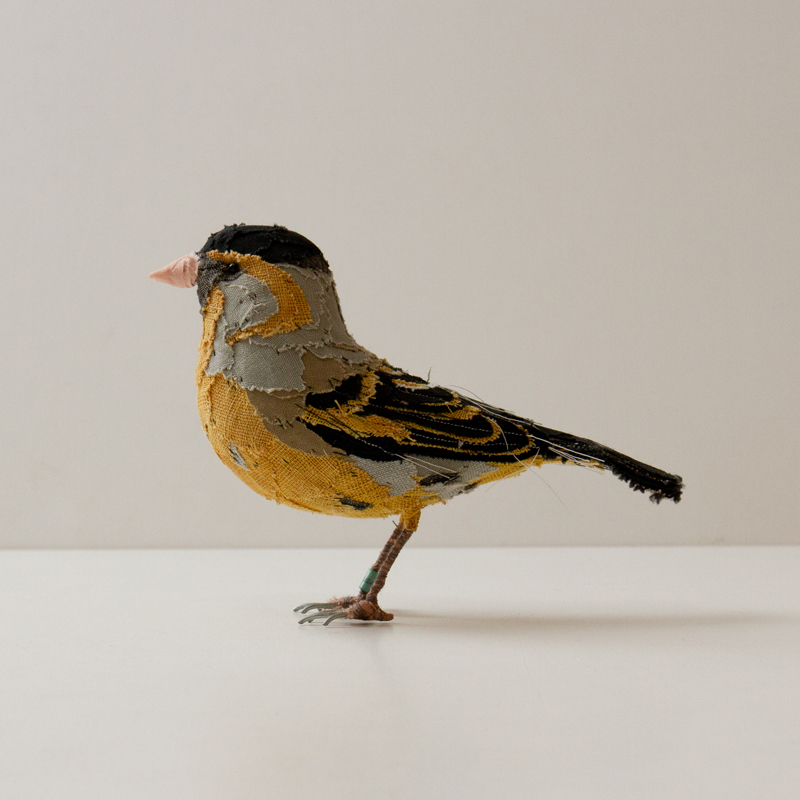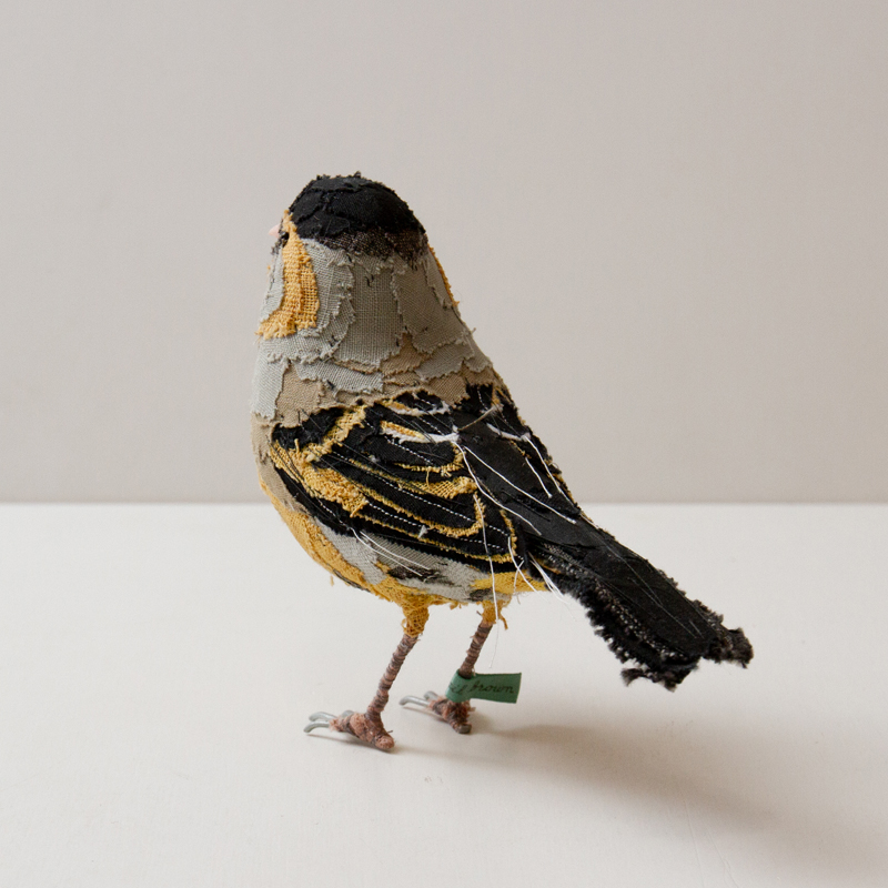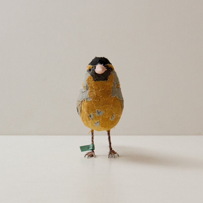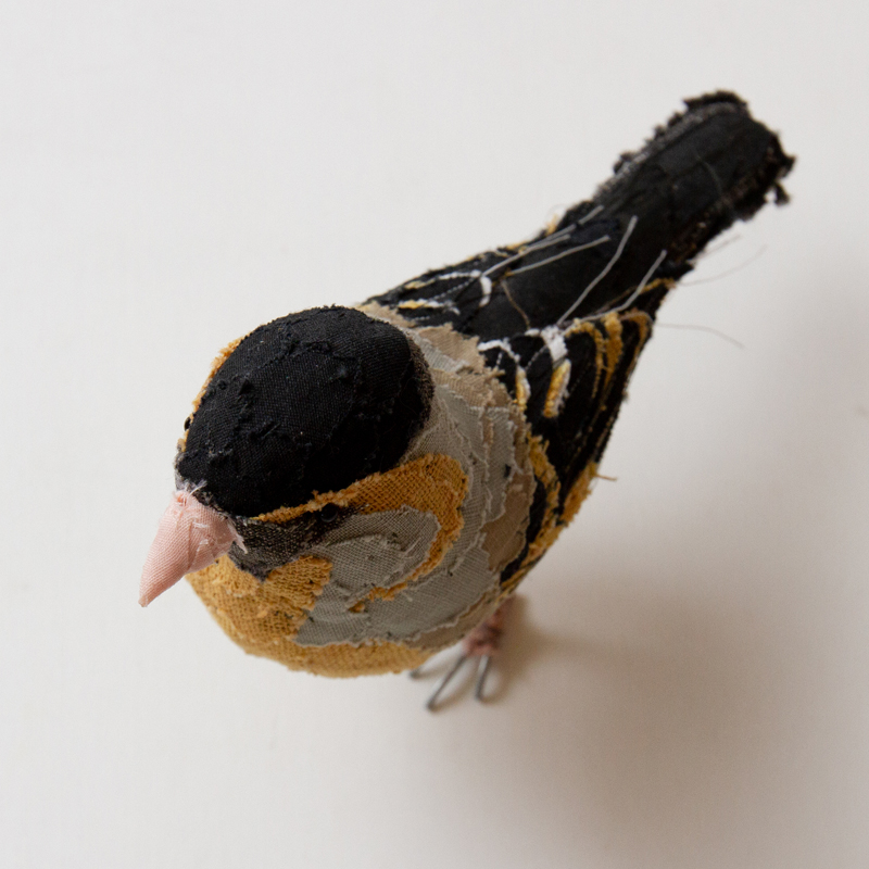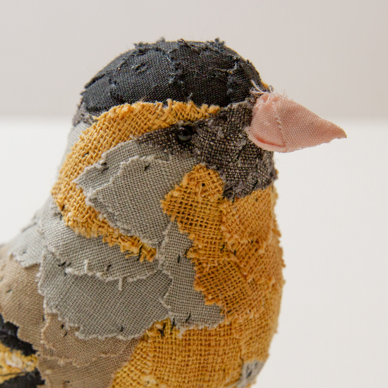 細かくカットされた布を丁寧に糸で留めて作られるバード。