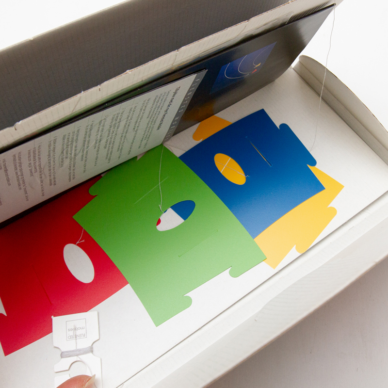 薄いプラスチックを組み立てて作り上げるモビールです。軽さが特徴のため、わずかな空気の動きでゆらゆらと動きます。