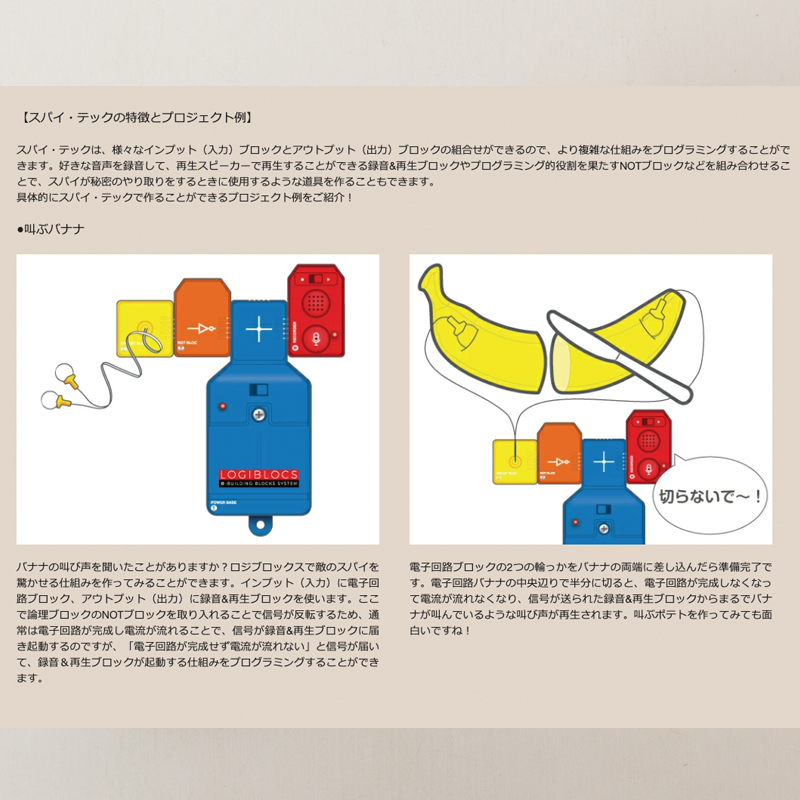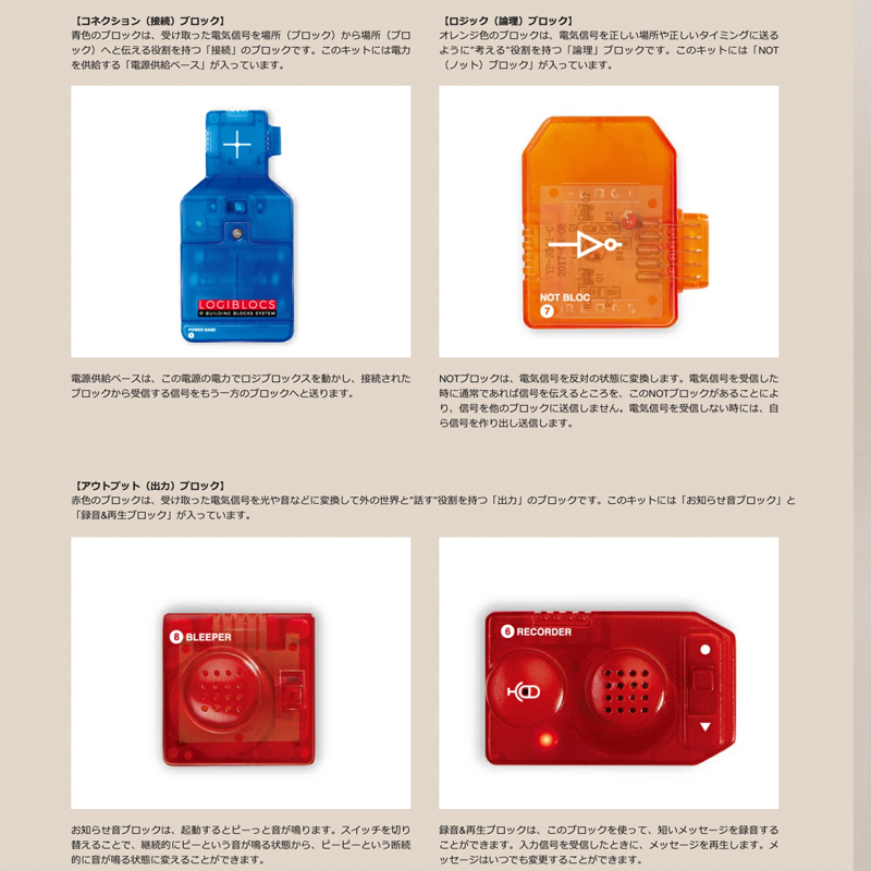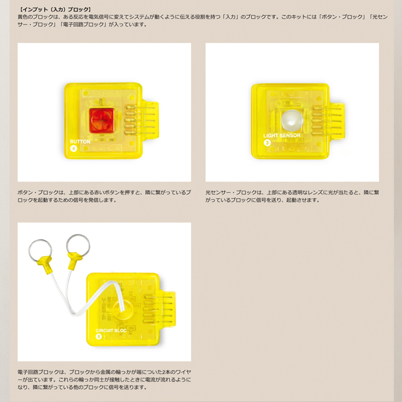 「光を感知するブロック」「ONの信号を送るブロック」「録音するブロック」などの個別の機能が備わったブロックを組み合わせたり入れ替えたりすることで、さまざまな機能を作り出せます。
