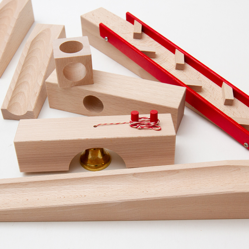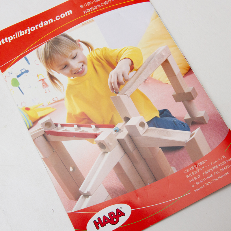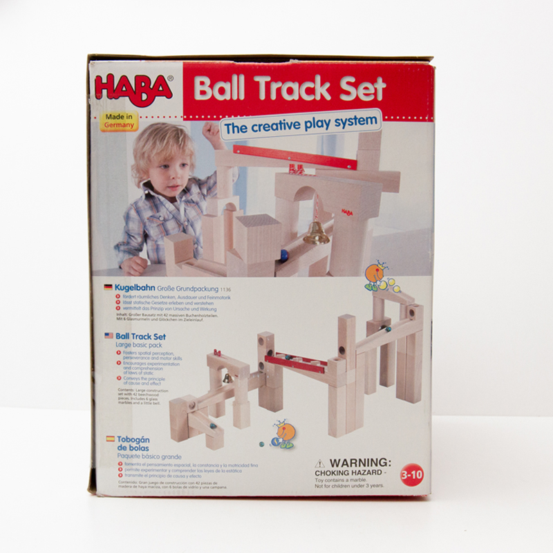 HABA社のビー玉を転がすコースを組み立てる玩具。基尺は4cmとなっています。ベルとスラロームパーツも含まれている大きなセットです。