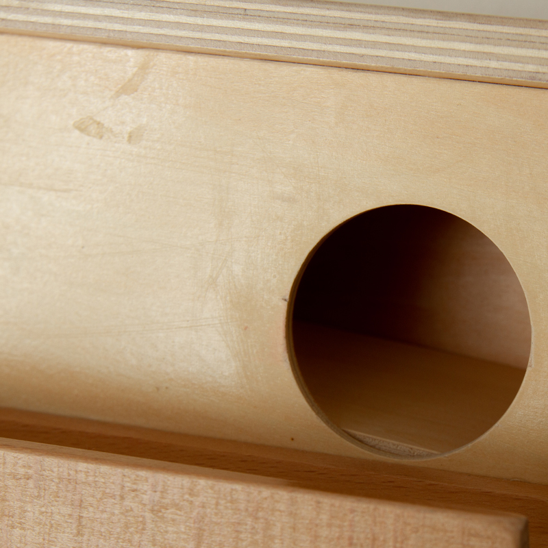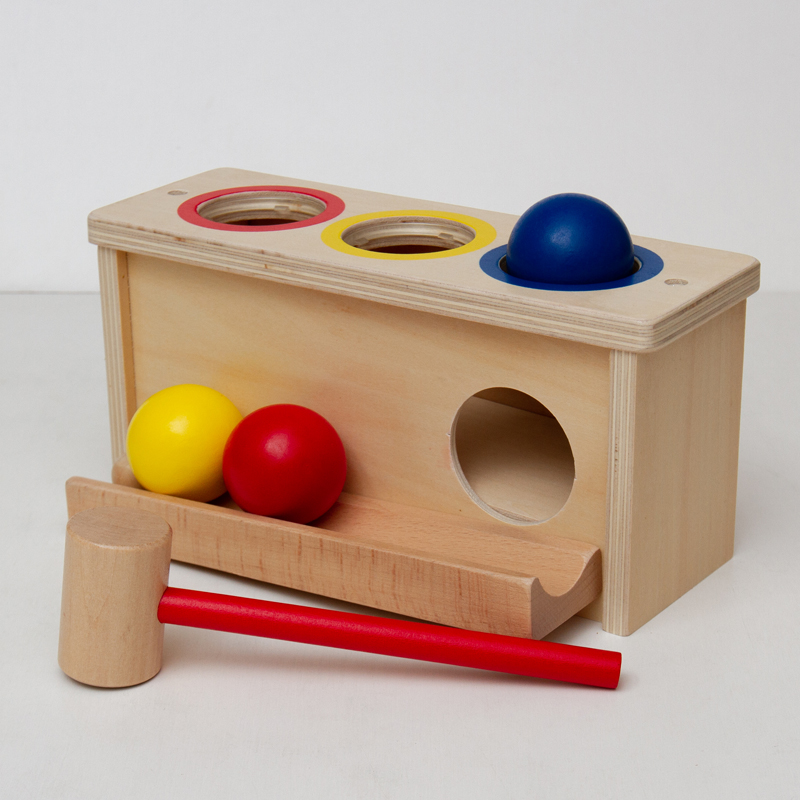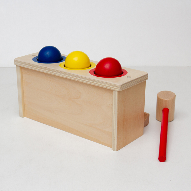 本体に木の玉をセットし、ハンマーでトントン叩くと内部にゴトンと落ち、手前のレールまでゴロゴロと転がってきます。ハンマーを使わず、手で押してもゴトンできます。