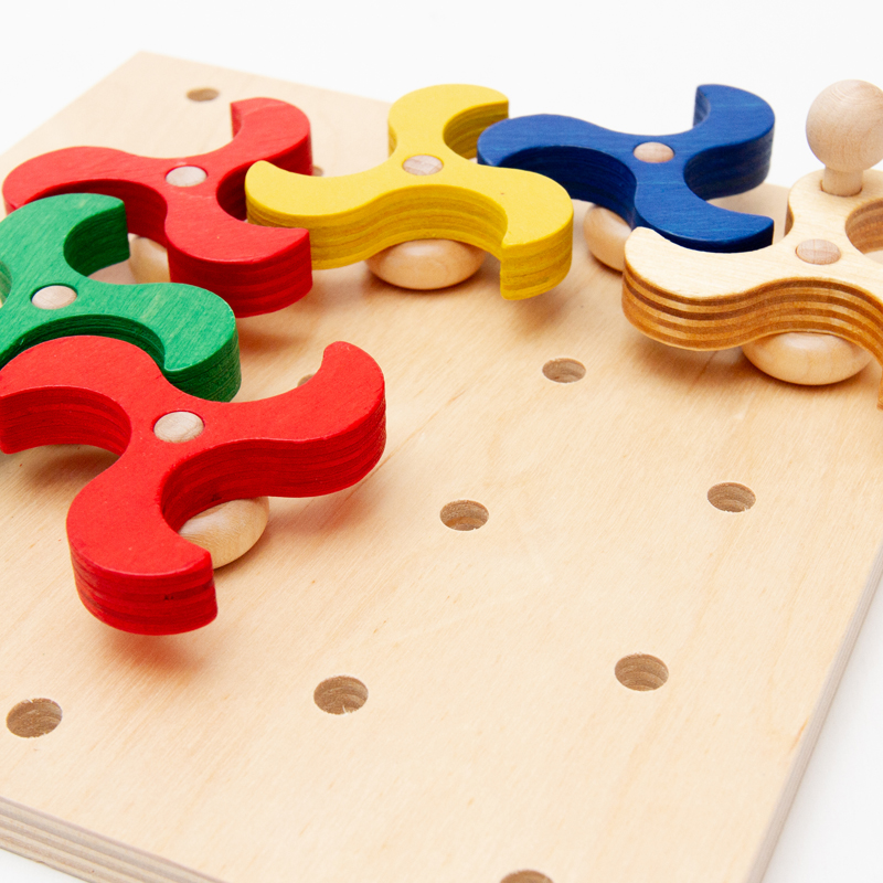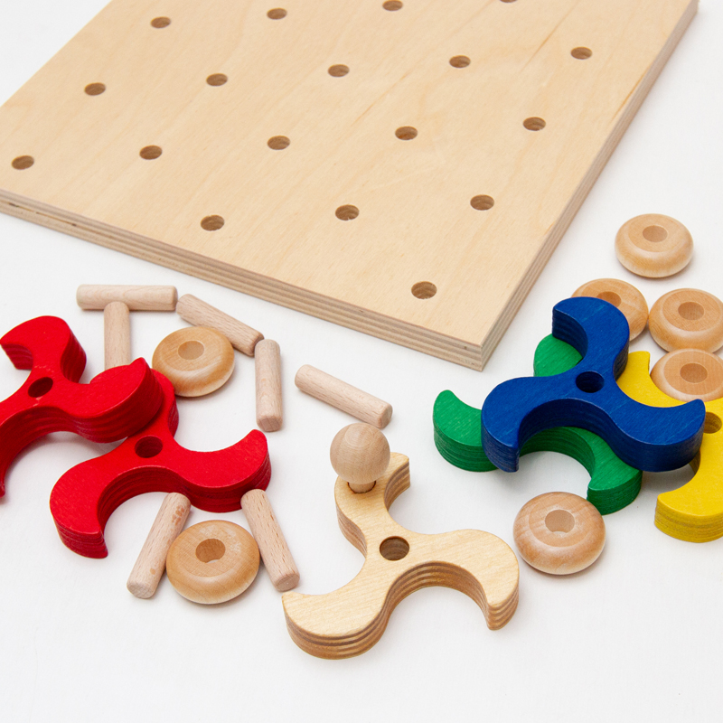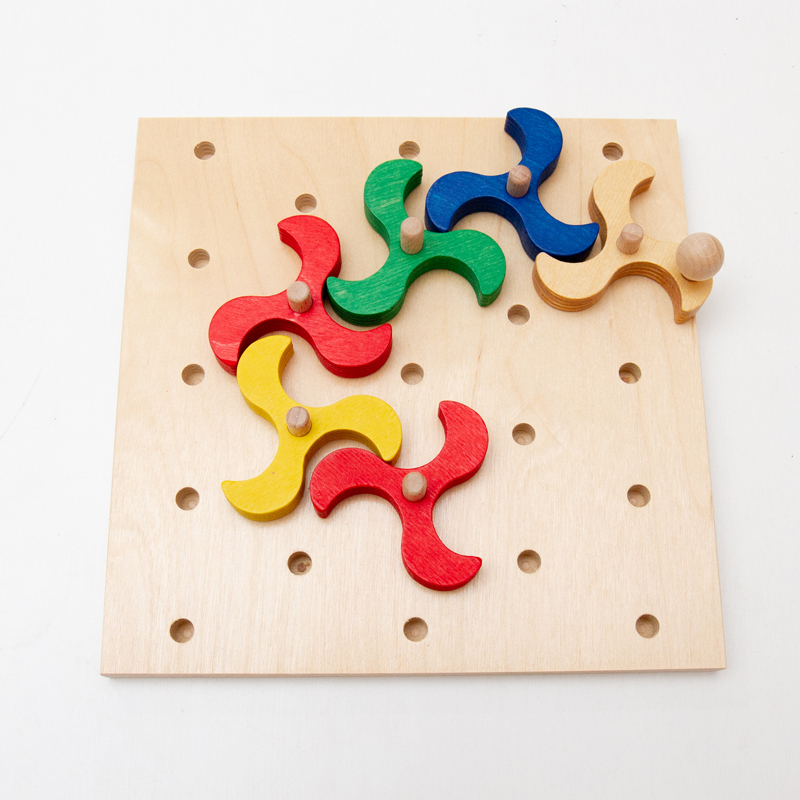 プロペラのようなパーツの位置を入れ替えて、歯車のように連動させて回転させることができる玩具。