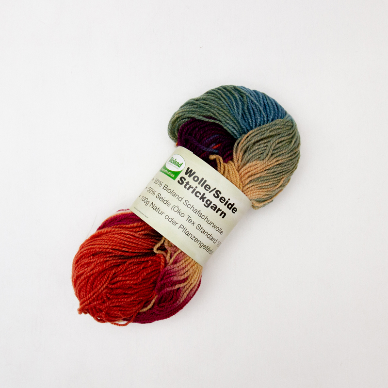 ウール50%、シルク50%のしなやかな手触りの毛糸。草木染めでおおよそ10cm間隔で色が切り替わっています。