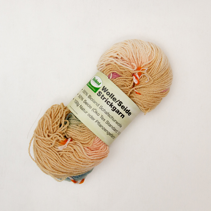 ウール50%、シルク50%のしなやかな手触りの毛糸。草木染めでおおよそ10cm間隔で色が切り替わっています。