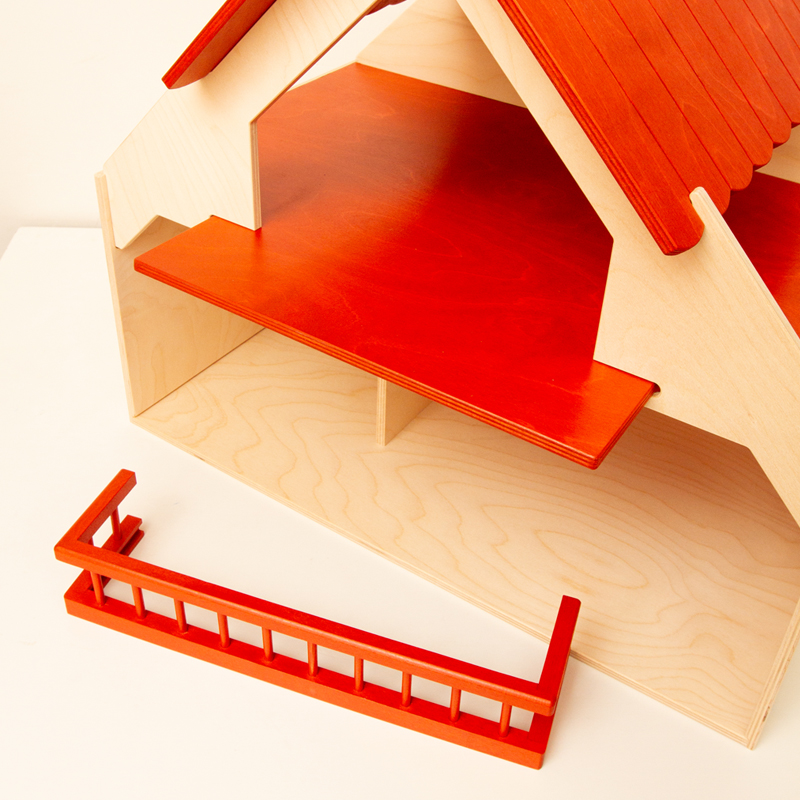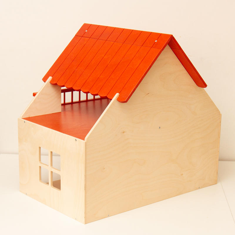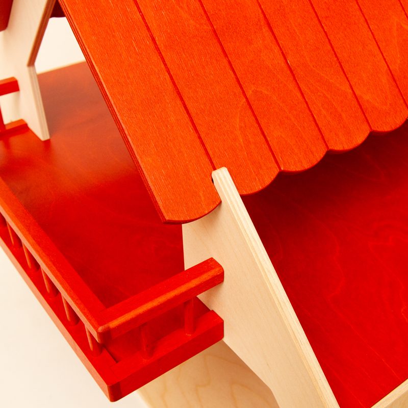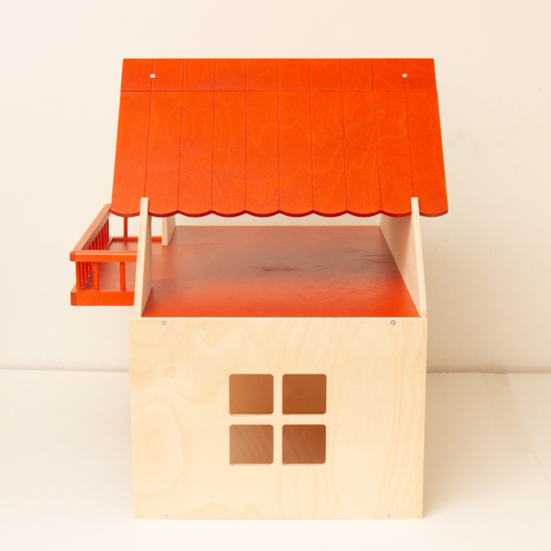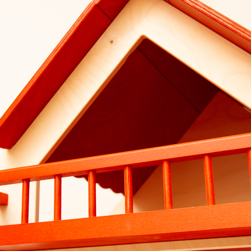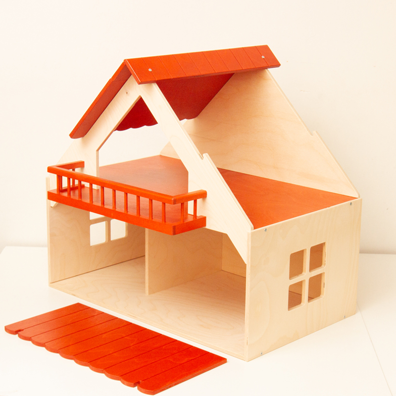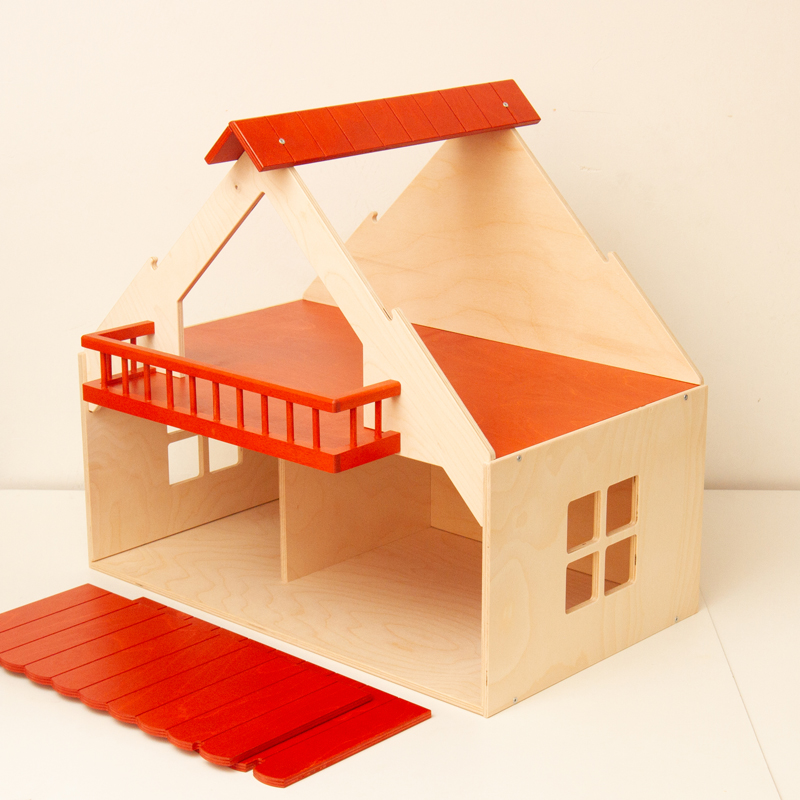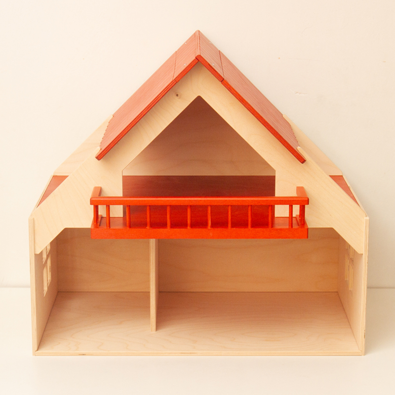 赤い屋根とバルコニーが特徴的なドールハウス。なかなか立派なサイズです。